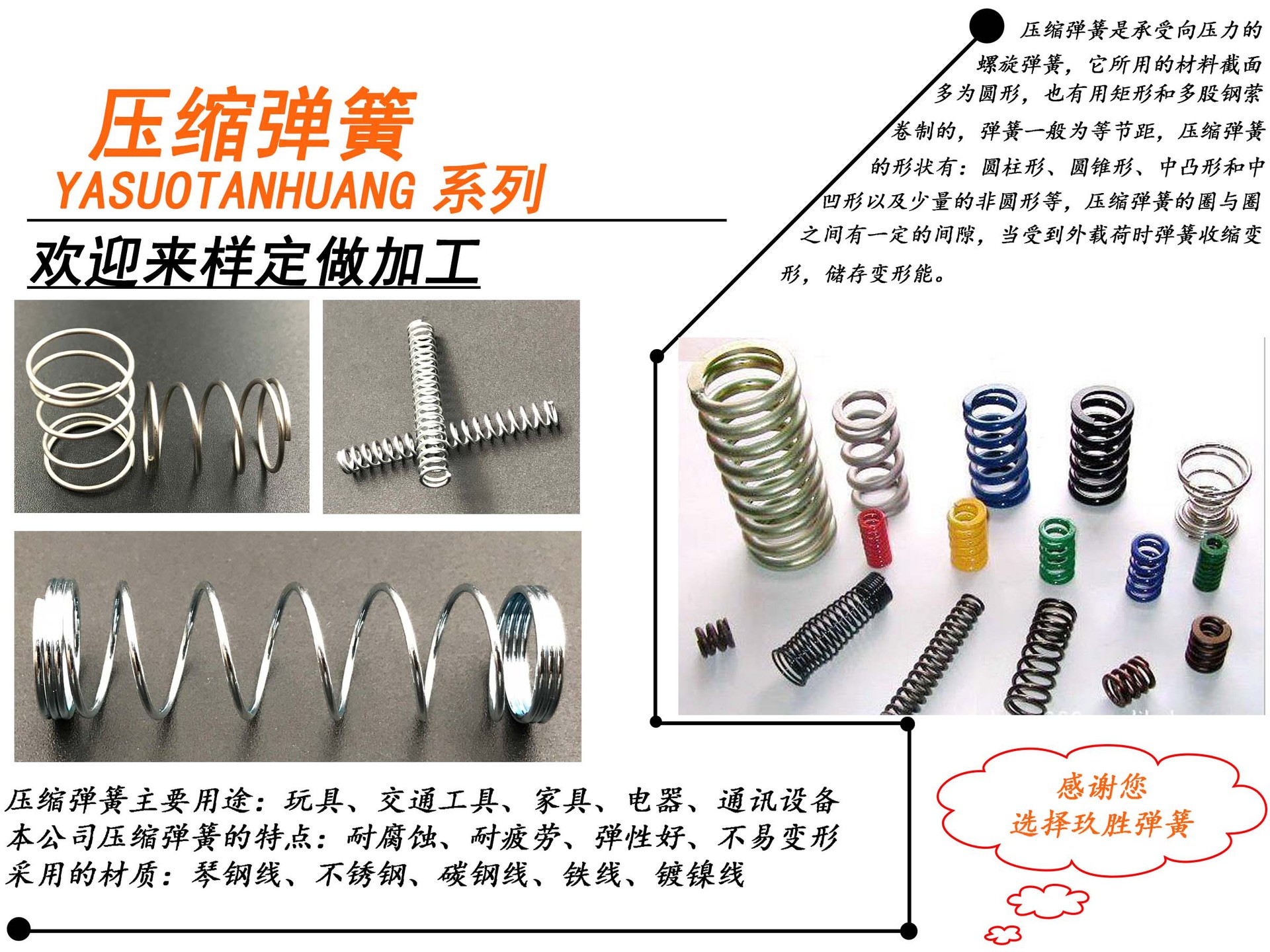 本公司生产的压缩弹簧具有耐疲劳、耐腐蚀等特性,经耐疲劳测试可达百万次以上而继续使用,采用材料也是经过多次筛选,弹簧色泽光亮,不易变形。产品广泛的应用于医疗呼吸设备、手工工具、玩具、减震、发动机气门弹簧等多种行业!!