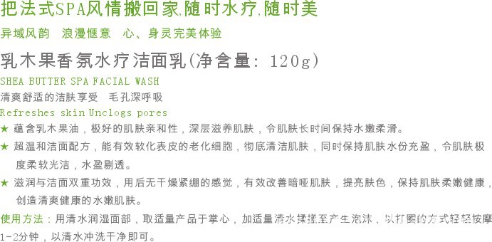 | 产品系列 | 乳木果香氛水疗 | 产品名称 | 乳木果香氛水疗洁面乳 |